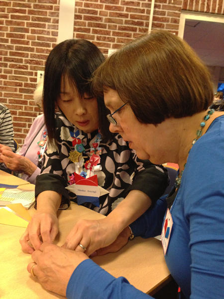 After a delicious buffet luncheon consisting of soup, assorted salads, bread, cheese, and many other hot and cold foods, I returned to the large meeting room called Lucasgat D. This was where the folders gathered in between meals and the formal workshops. The entire room was decorated with red, white, and blue origami-decorated pennants that hung from the ceiling. It was very festive! I set up a display of the models I would teach during the weekend. Folders would stop by my table to meet me and learn how to fold some of my models. The Fairy Penguin, Postman Snail, Magic Chair, Bear, and Sitting Dog were very popular. My table was busy the entire weekend. Every seat was always full.