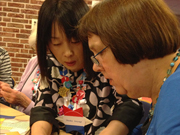 On Sunday morning the committee members suggested I take a break from teaching to attend a formal workshop. I chose the workshop, "Christmas Cards" taught by Joke Mooij. This was my first experience in an origami class that was taught in Dutch. It was fun! Joke is a good teacher. I sat next to Carla. She was very kind and helped me cut the cardboard I needed to make my cards. Joke taught us how to make three different kinds of cards. She showed us how to fold two beautiful stars. I liked the paper Joke chose for the stars!